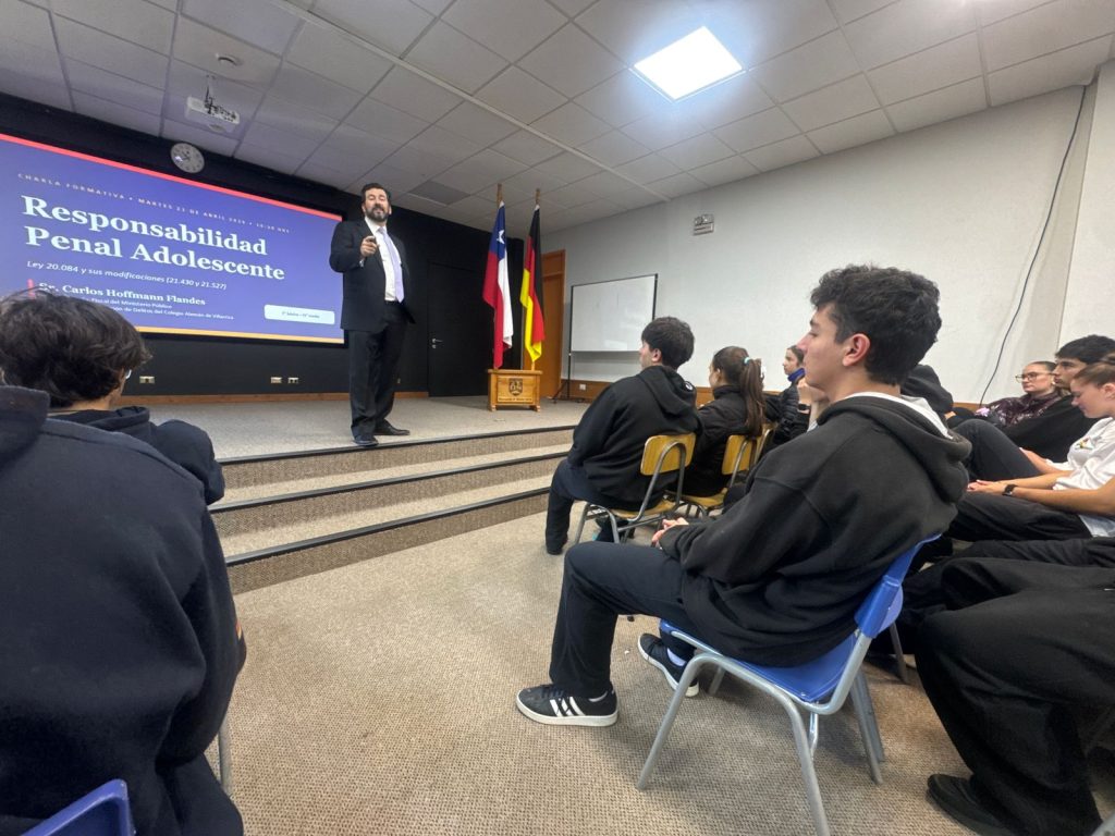 Ayer martes recibimos la visita de Carlos Hoffmann Flandes, abogado y ex fiscal del Ministerio Público, quien conversó con los estudiantes de 7° básico a IV medio sobre la responsabilidad penal adolescente, la Ley 20.084 y sus modificaciones.